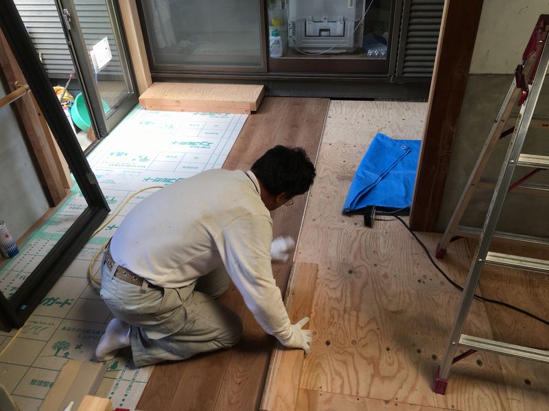 橿原市K様 進捗状況です! 前回はK様邸の下水道工事をさせて頂いた話をさせて頂きました。 今回は、その後新たにトイレをすることになったお話です。 K様の家は古く、トイレが「離れ」といわれる、家から遠い場所に設置してあります。夜は暗く、しかも段差が多い。 そんなトイレを、行きやすい場所に設置し、しかも出来る限り段差を少なくするという工事です。 設置場所や、工事方法を何度もお客様とお打合せさせて頂きまして、行っています。 2017-05-17 neda 下水道工事の際に、綺麗にしたコンクリートの土間の上に、木材で床組みの下地を行いまして。 2017-05-18dannetu 冬場寒くならないように、断熱材を入れました。 2017-06-02 hari 納め方が難しいところが結構ありますが、大工さんたちと打ち合わせしながら、お客様にも相談しながら、丁寧に仕上げていっています。 2017-06-02 floor あともう少しで床も貼り終わり、トイレ設置まであと少し。来週には新しいトイレも使ってもらえるかなといったところです。 お客様とも会話が弾み、いつも楽しく仕事をさせて頂いています。毎日感謝の言葉を言っていただいて、職人さんも、すごくやりがいがある!と喜んでくれています。ありがとうございますっ!
