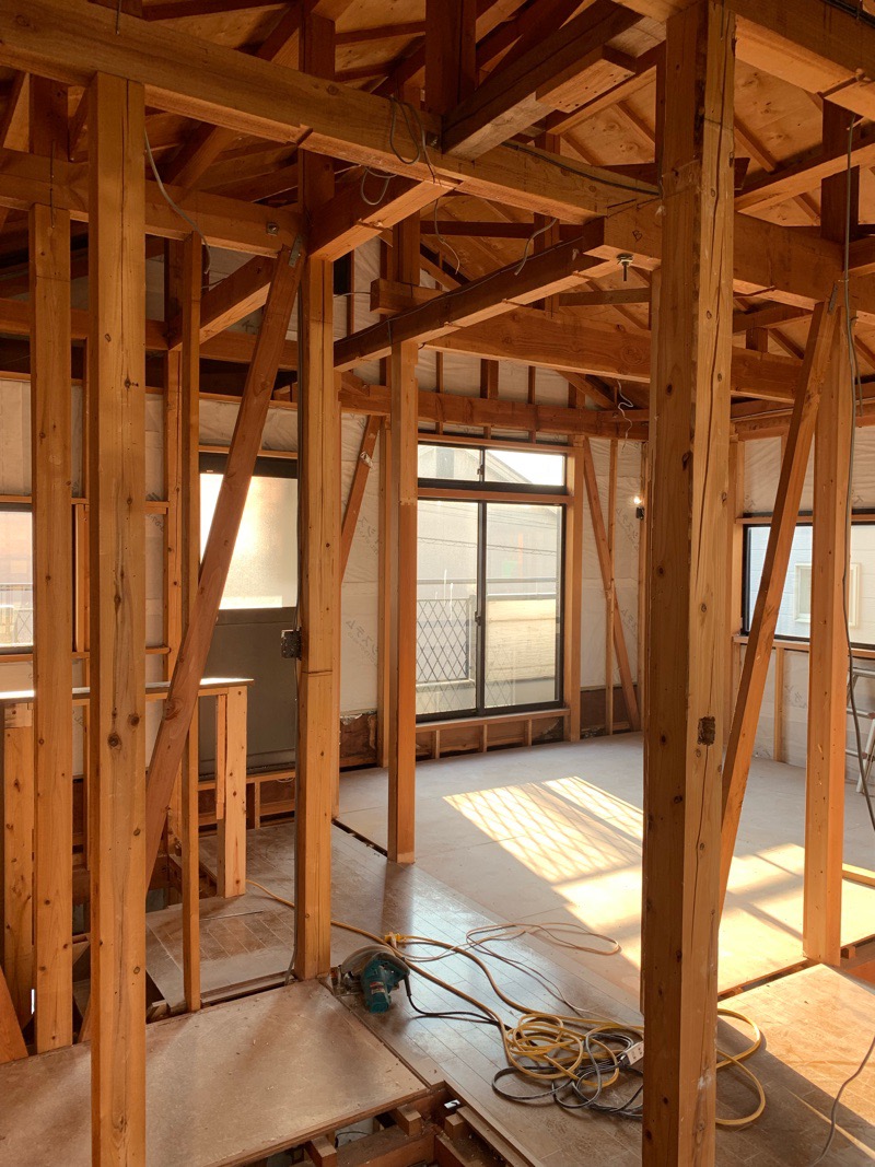 工事は、解体が順調に進み、外壁以外は、躯体(柱や土台や梁などの家を支える大切な構造部分)が残るのみ。