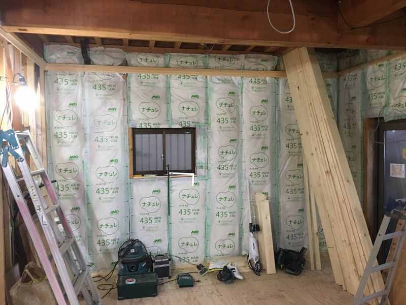 内部は断熱材を入れ直し。丁寧に壁に入れていきます。