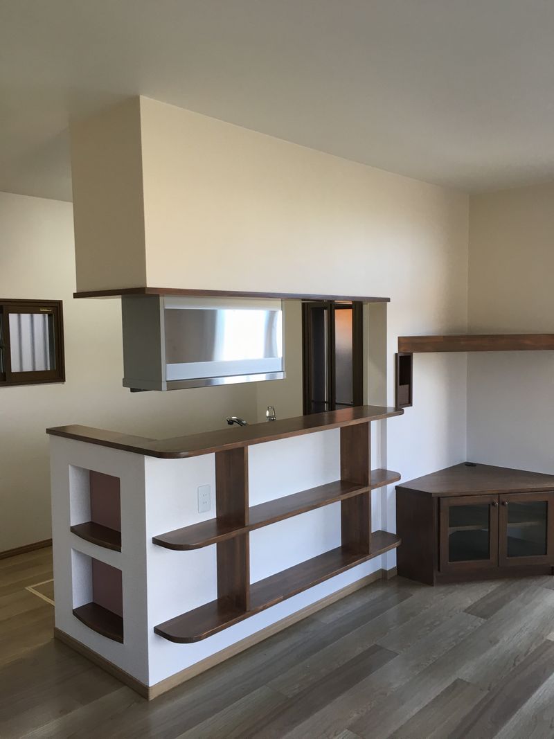 大工さんに、テレビ台や、カウンターの造作、ニッチカウンターなども製作してもらいました。ちょっとした小物の整理に使えそうです。