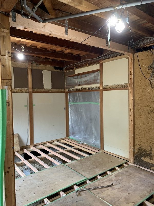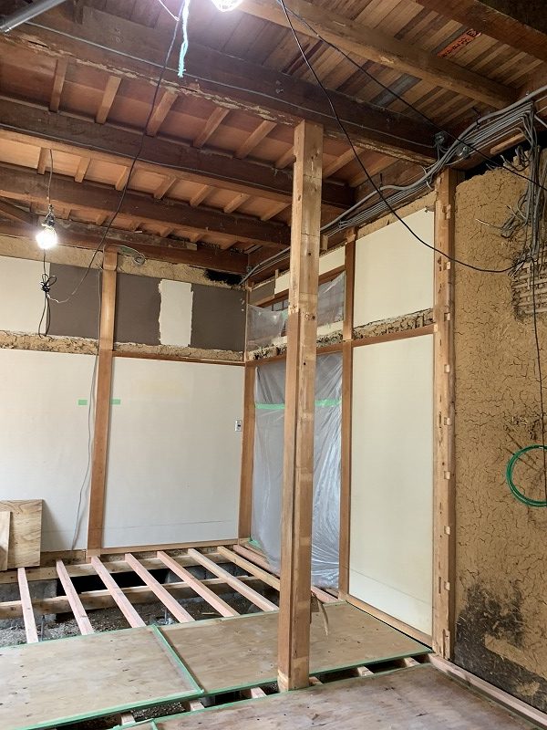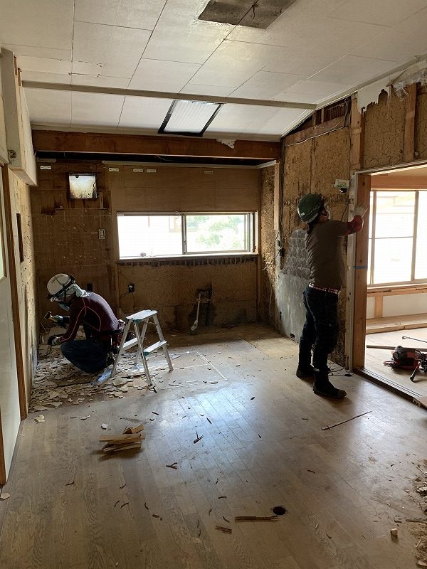床・壁・天井、水回りは全て解体・撤去。内装は全て新しくします。壁のボードをめくると、昔ながらの土壁が出てきました。古い電気の配線もあらわになってきます。