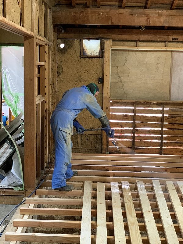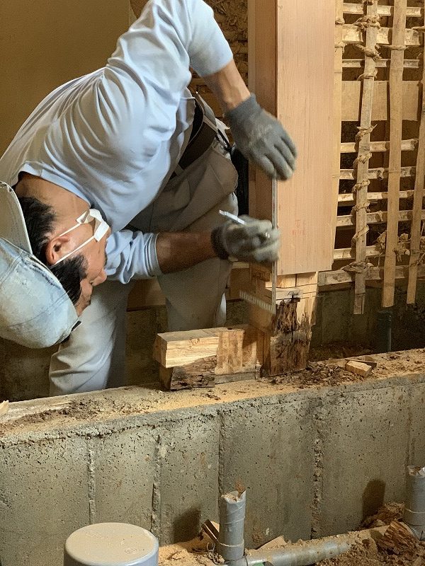 下地の木材がある程度入れ終わったあとは、白蟻予防のために薬剤を散布・注入させて頂きました。工事範囲でない場所も、念のため薬剤を。写真の作業員さんが泥だらけなのは、床を潜って作業してくれたからです。大変な作業。ほんと頭が下がります。
