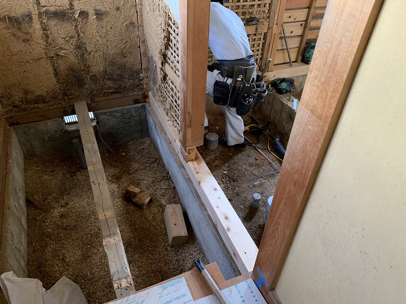 白蟻の被害の箇所も、見受けられました。柱や柱を支える土台などの、家の構造に関わる部分については、部材を入れ替えたり、補強するなどの対応も必要です。このあたりの工程のときは、大工さんだけでは判断しづらいこともありますので、私はほとんど張り付いて、対応させて頂いています。