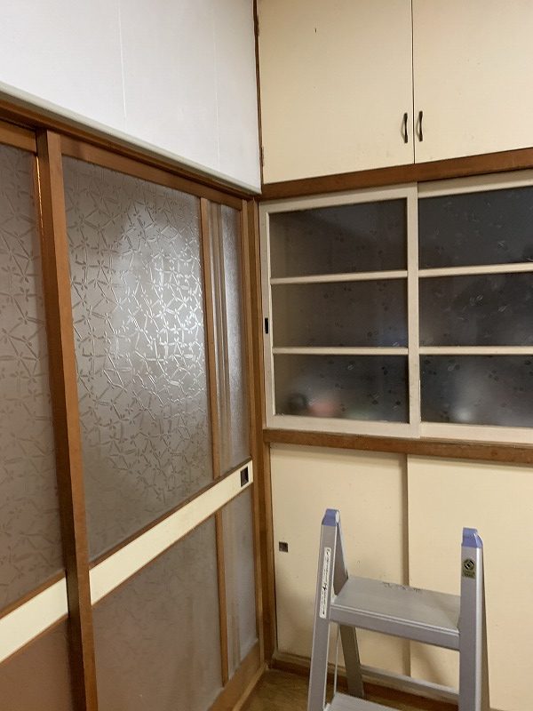 台所には、こういう水屋、収納もあるんですが、これも古く見えるので、新しくしたい。とのこと。確かにレトロですよね。