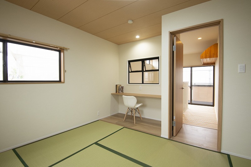 前回の吹き抜けの空間との間に、間仕切りをつくり、書斎カウンターの板の間と、畳の間をセットでアレンジ。