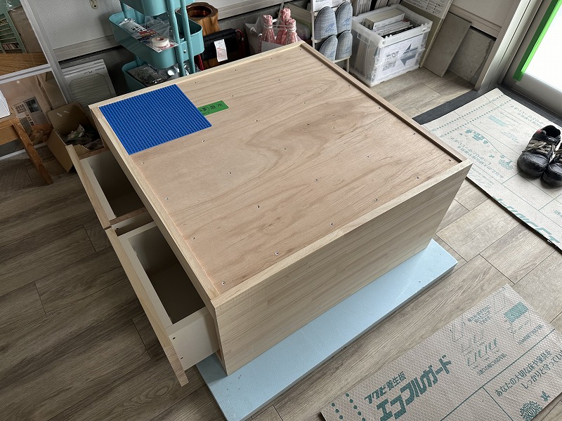 工程的に、現場で作業できない日を活かして、弊社の作業工房にて、製作しました。コタツより大きなイメージで、そして重いw