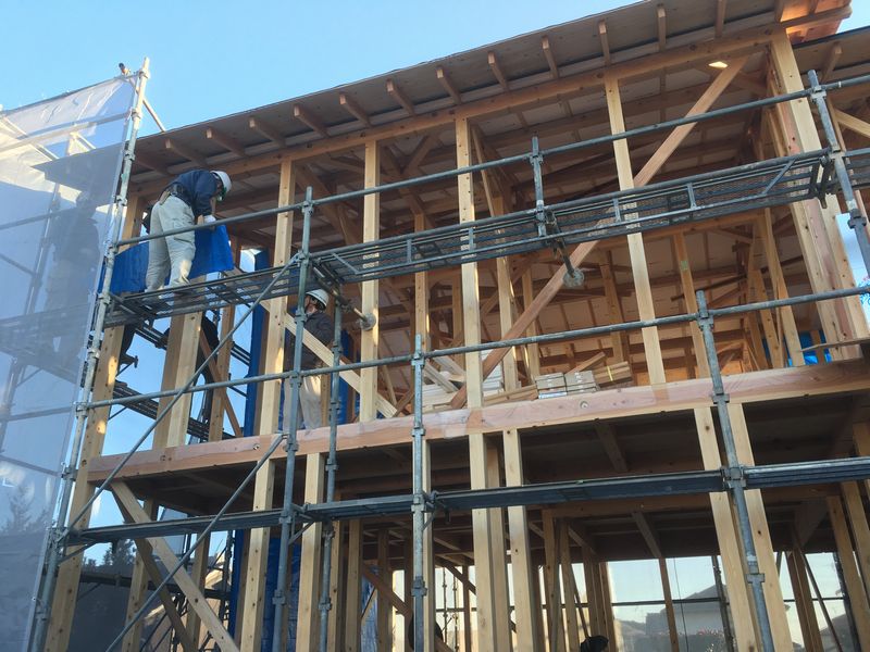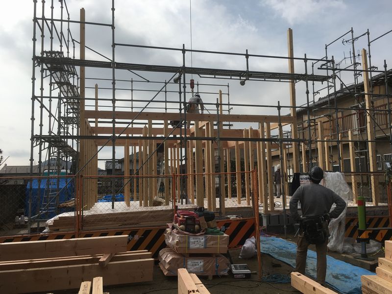 基礎工程のあと、いよいよ本番の「棟上げ」です。