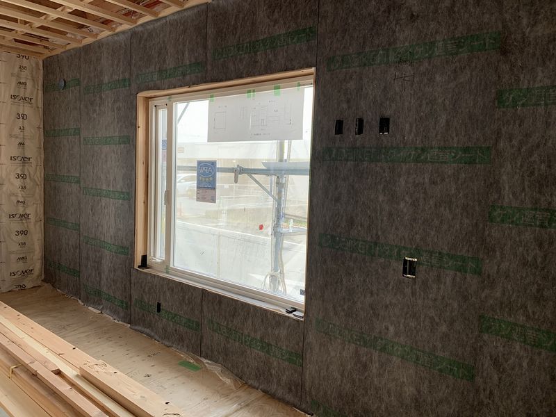 あとは、壁に断熱材を納めていくのですが、それに加えて、防音の工事もオプションにて実施。車の音がかなり軽減された印象です。
