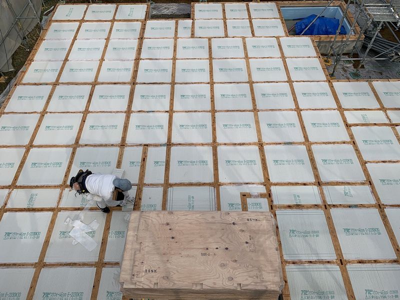 断熱材の上から、合板(28ミリの厚さ)をしっかり敷いて、固定。