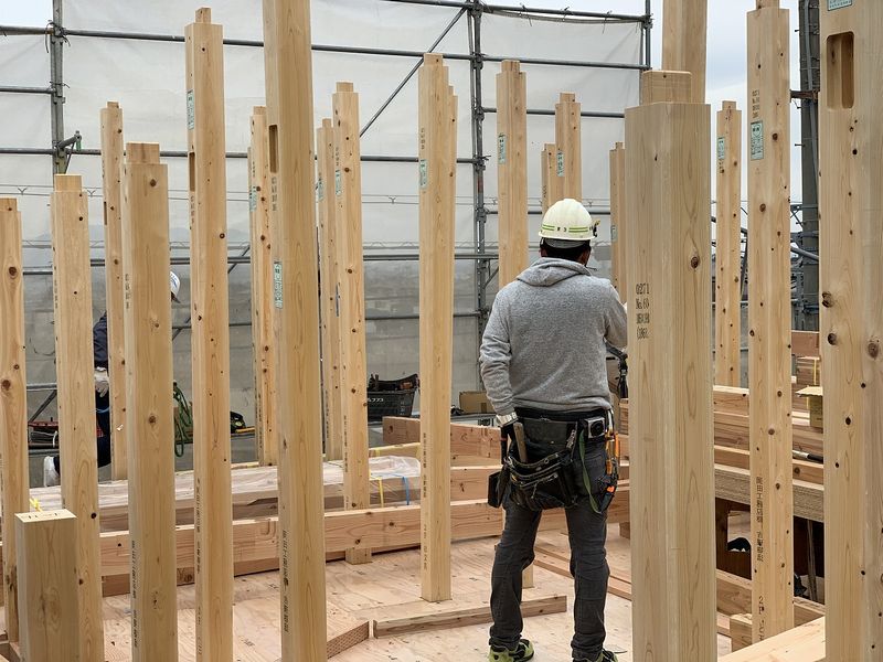 2階建ての場合、数日前から土台や1階部分を組んでいくことにしていますので、大工の棟梁たちと、上棟に向けて前へ前へ。