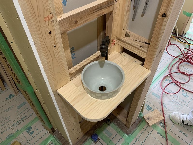 こだわりの陶器製の洗面器を支給いただき、収まるように作っていきました。