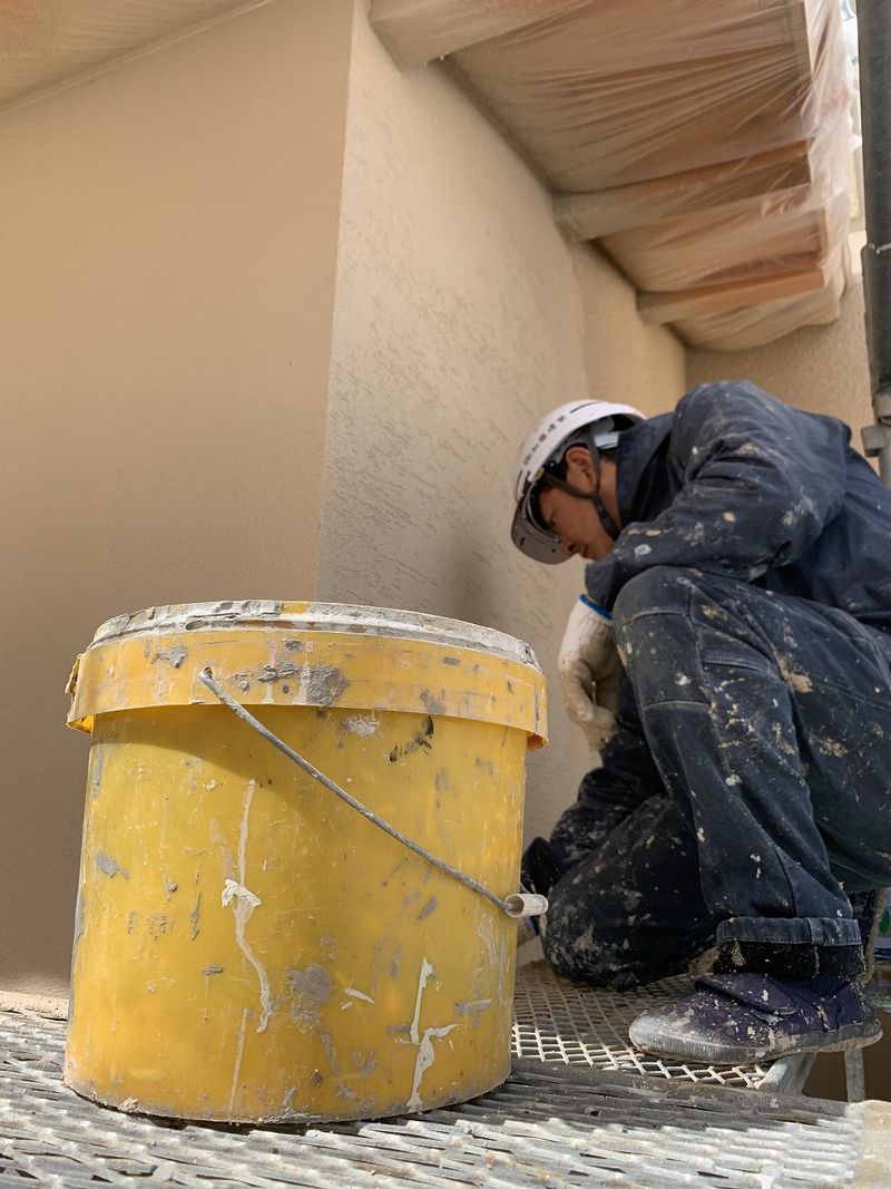 外壁は、塗り壁調に。こてで仕上げた雰囲気のある壁は、塗装親方が一人で仕上げ。一人で仕上げないと、場所ごとに仕上がりがブレてしまうからで。。。ほんと、お疲れ様です(‘◇’)ゞ!!