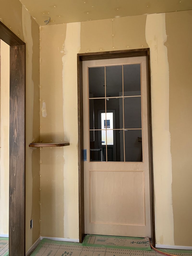 こだわり抜いた、オリジナル建具も出来上がってきました。全体のバランスを、お客様が納得いくまで、ミリ単位で調整した建具です。これを濃い色に塗装して、ガラスを入れて。。。と完成まではあと少し。