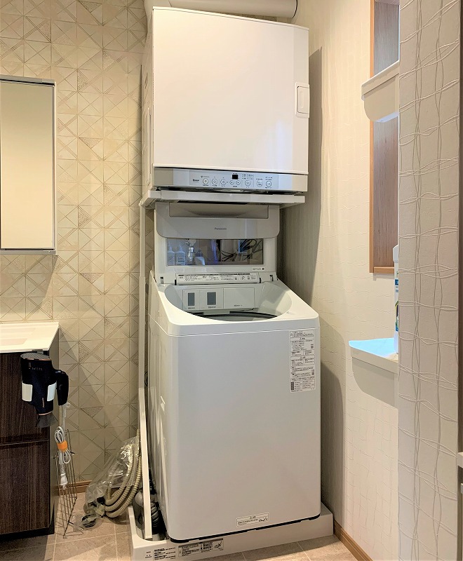 2枚目の写真は、下に、縦型の洗濯機を設置しました。洗濯機も岡田工務店でご用意させて頂きました(ちなみに家電も扱っていますので、住宅ローンなどにも組み入れることもできます)。