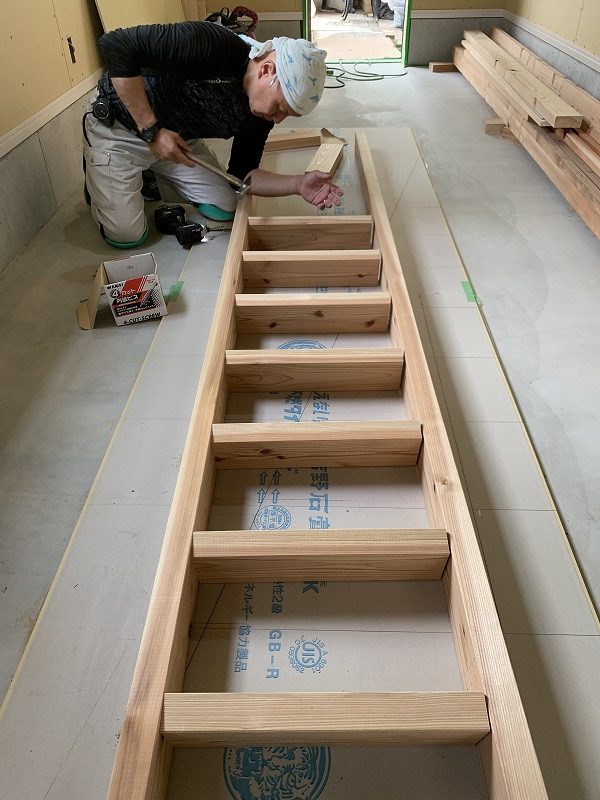 ロフトに上がる梯子も、下地材を使って、オリジナルで製作しています。