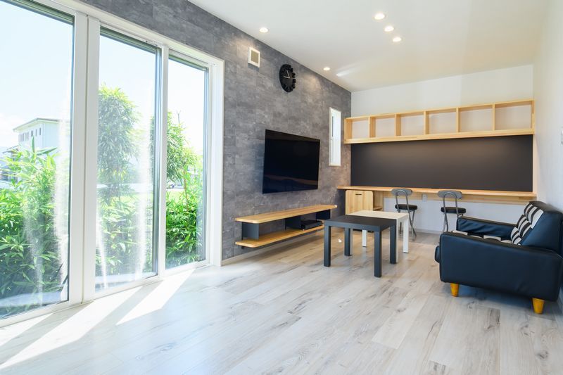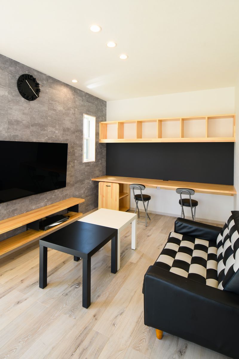 リビングスペースは、壁掛けテレビ、スタディスペース付きのお洒落な空間に。