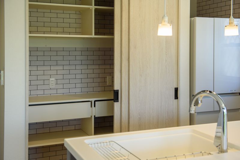 収納はオリジナル造作棚で、扉ですっきり、中身を隠せるスタイルにさせて頂きました。