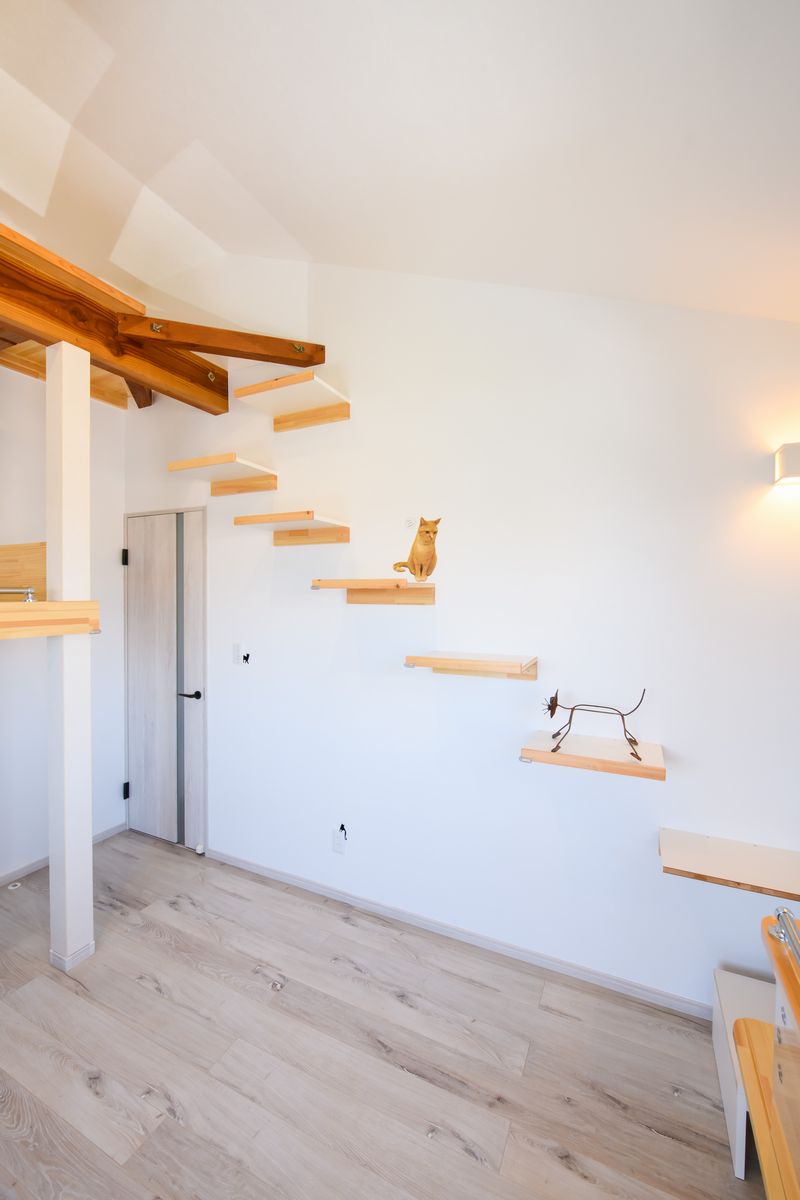 猫ちゃんのために、キャットウォークの動線を考えながら、収納棚にも使えるアイテムを、端材なども活用しながら製作しました。