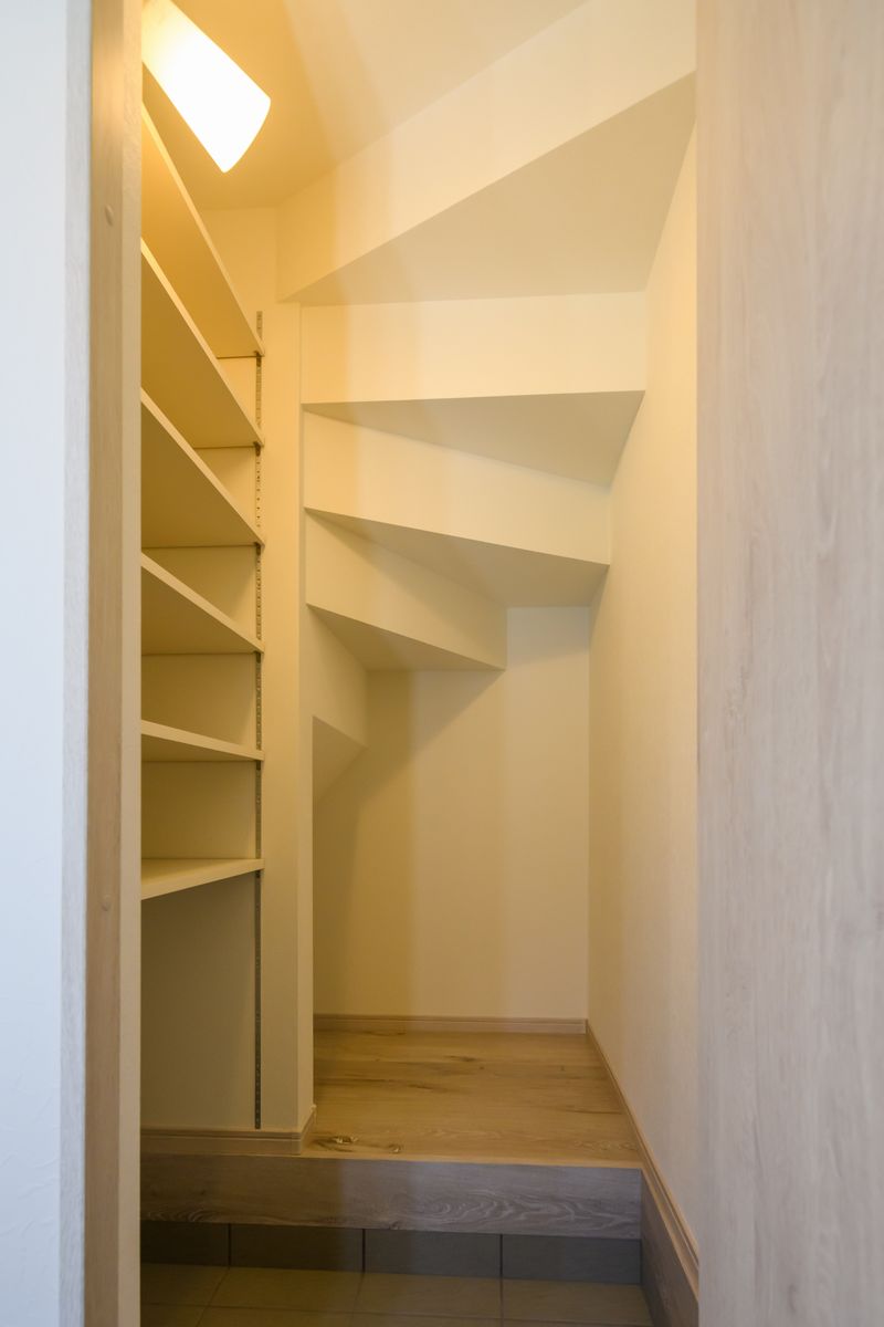 玄関の靴箱を無くし、階段下のスペースを靴箱に活用。冬用タイヤの置場にも使えるスペースです。扉も付いてますので、来客対策もバッチリです。