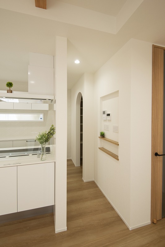 パントリーへの動線である、アール開口もいい感じ。