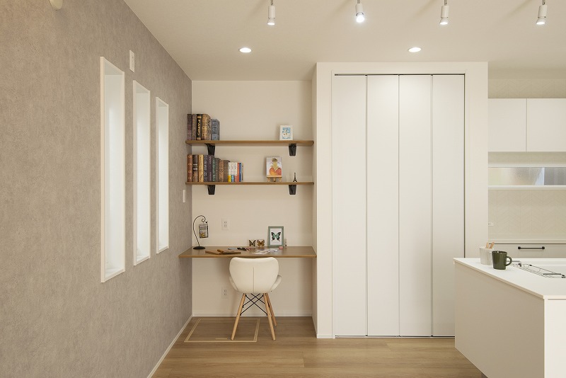キッチンの近くには、カウンターデスクも配置。