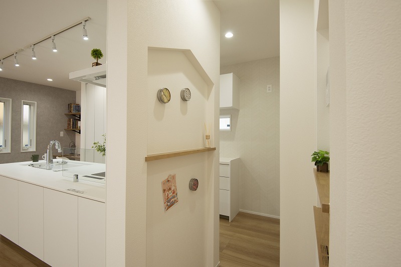 キッチン横にも動線を。通路の両側には、子供のプリントが貼れるマグネット対応のニッチ壁を。「鉄板方式」ですので、「鉄粉方式」よりも丈夫です(少し細かい話なので、通じれば良いんですが。。。)。