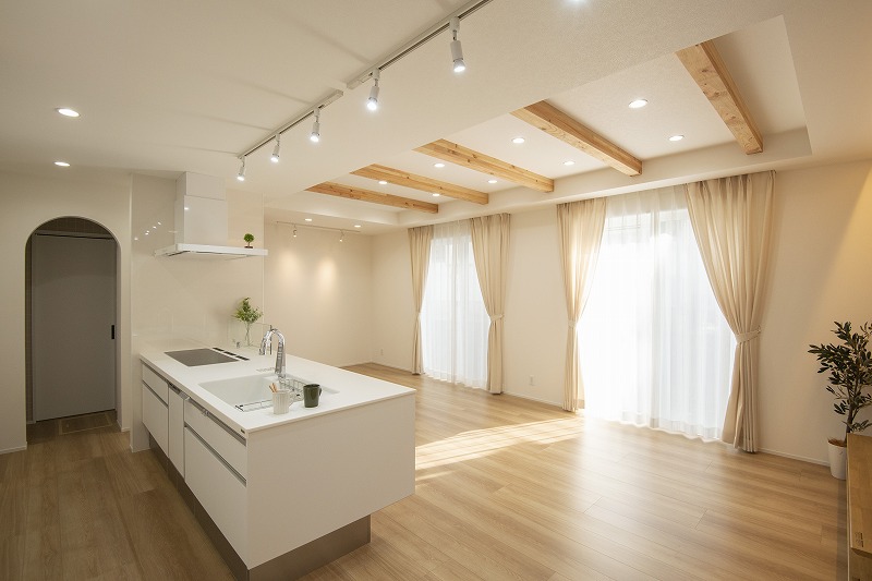 化粧梁がアクセントの、高い天井に、均等に並ぶダウンライト。