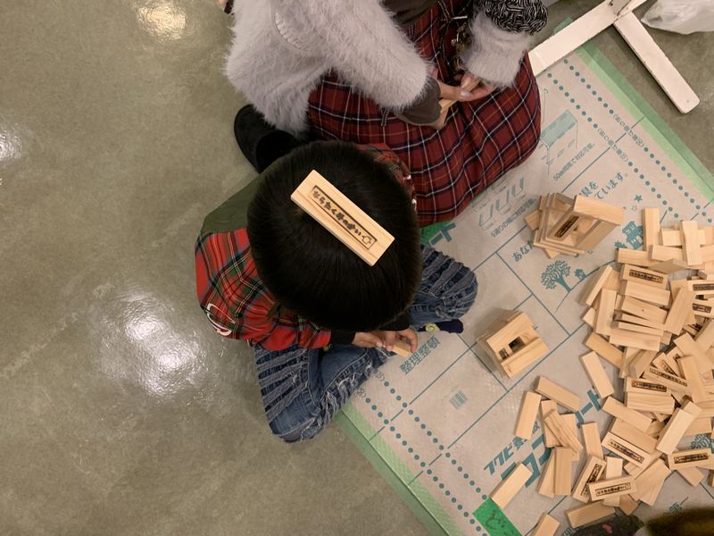 弊社は、奈良県産の桧(ひのき)を使った積木コーナーで、気に触れる楽しさを伝えました。