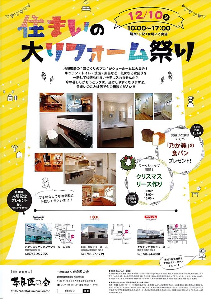 奈良匠の会として、メンバー工務店14社にて、県内3ショールームにて同時イベントを開催します!