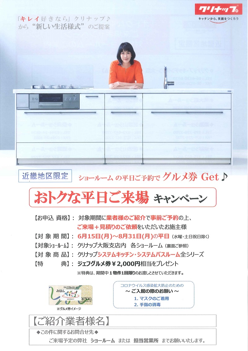 住宅設備メーカーの「クリナップ」さんでは、平日期間、①来場予約②来場③見積プラン作成、のお客様にグルメ券のプレゼントを実施しています。